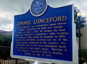 This stop on the Mississippi Blues Trail marks the birthplace of Jimmie Lunceford, a great American jazz alto saxophonist and bandleader in the Swing Era. Lunceford was born on a farm in the Evergreen community, west of the Tombigbee River, near Fulton. The 53-acre farm was owned by his parents, James and Idella. Seven months after James Melvin was born, the family moved to Oklahoma City. Lunceford went on to form the Jimmie Lunceford Orchestra, which recorded such famous songs as “Rhythm is Our Business,” “Wham(ReBop-Boom-Bam),” and “Uptown Blues.” They also performed at the Harlem nightclub and The Cotton Club. Jimmie died at the age of 45 in Seaside, Oregon before a slated performance at The Bungalow Dance Hall.